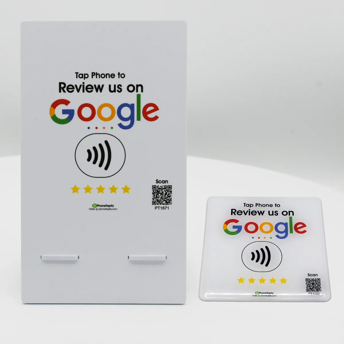With our cutting-edge Google Review NFC Table Stand, you can easily improve customer interaction and expedite feedback collecting. This revolutionary digital tool is a must-have for modern businesses looking to leverage the power of technology to interact with clients. It is precision-crafted and meant to boost your brand.Key Features:Sleek Design: Our NFC Table Stand has a sleek and modern appearance that can mix well with any environment. Its proportions of 110*253mm, with a mild bend at 190mm, guarantee that consumers have an excellent viewing angle.Premium Materials: Made of high-quality Epoxy, PVC, and paper, this table stand is both durable and elegant. It is designed to resist regular wear and tear while remaining fashionable.NFC Technology: This stand’s innovative Near Field Communication (NFC) technology provides smooth interactions between clients’ cellphones and your Google Review page. Users may now visit your review page with a single swipe, eliminating the need for laborious URL sharing.Effortless Setup: The Google Review NFC Table Stand is simple to assemble. Simply set it on your tables, countertops, or reception desks and watch as your clients easily navigate to your review page to provide comments, testimonials, and reviews.Boosted Online Presence: Encourage happy customers to submit reviews, boosting your internet visibility and attracting new consumers.Versatile Applications: This table stand is suited to a variety of businesses where client input is important, including restaurants, cafés, hotels, retail stores, clinics, and more.Improve your company’s reputation management approach. Invest in the future of consumer engagement and observe technology at work. Order now to start building true relationships with your valued customers.Sticker:Introducing the Google Review NFC Card Window Sticker, your top tool for amplifying online reviews and boosting the reputation of your company. This clever sticker is the ideal tool for enhancing your online presence because it is made to easily connect with clients and promote effortless feedback.Specifications:Dimensions: The Google Review NFC Card Sticker has a 60*60mm size that is both svelte and small. It may be easily installed on any window or surface thanks to its optimal size without blocking the view.Material: This sticker is made of high-quality materials and comes in two elegant colours: White PVC and Black PVC.This sticker comes with strong 3M glue adhesive, which ensures a solid and long-lasting adhesion to any surface. You can be sure that it will remain in place, enduring the weather and promoting your company 24 hours a day.Chip: This NFC card supports flawless connectivity with NFC-enabled devices thanks to the cutting-edge NTAG215 chip. Customers may easily engage with your company via smartphones, tablets, or other NFC-enabled devices.Antenna: A state-of-the-art bronze wire bonding antenna is included with the Google Review NFC Card Sticker. This guarantees the best possible data transmission and enables quick and effective evaluations with each tap.How it functionsShow off with pride: Easily affix the NFC card to your storefront window or any other prominent spot where it attracts the attention of customers/clients.User-friendly interface: Customers may visit your Google reviews page right away by tapping their NFC-enabled device on the sticker. Delete the annoying QR codes and URL sharing.Boost your standing: In the modern digital era, genuine Google reviews are the lifeblood of trustworthiness. Encourage pleased consumers to submit reviews so that additional prospective customers will arrive at your door.With the Google Review NFC Card Sticker, you can harness the potential of NFC technology and advance your company. Discover how simple it is to collect sincere testimonials, improve your internet visibility, and create long-lasting relationships with your clients. Today, unleash the potential of your company!